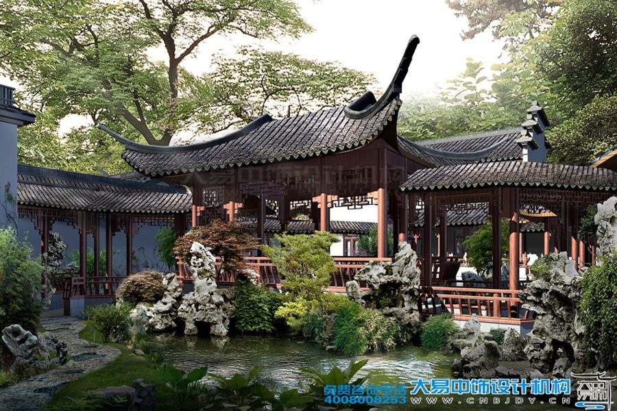 案例賞析:中式園林按照地域劃分主要分為兩大派:北方園林及江南園林。本套位于鄭州中式園林設計效果圖,取決于所在地域的優勢,以精致唯美的景觀塑造及空間處理手法傳承了古典亭臺閣樓及堆石藝術的精髓。融入大量的現代設計語言,讓傳統文化與現代時尚元素在時間的長河中得以邂逅。當然,它并不是純粹的傳統堆積,而是大易中飾設計師通過對古典文化的理解與認識,以現代人的審美需求打造出富有韻味的園林景觀。除此之外,最大的亮點當屬園中大量的白墻青瓦、廊柱亭榭多仿造江南園林的樣式,如同中式山水畫一般佇立于人們的眼前,溫婉秀美,引人入勝。