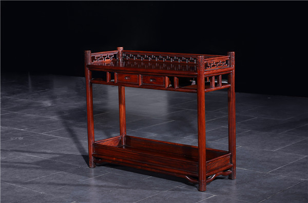 1、臺類紫檀木家具的控制面板,為了更好地保護漆層不被刮傷,又要表明木料紋路,一般在臺表面置放厚玻璃,且在玻璃與木制櫥柜臺面中間用小玻璃吸盤墊分隔。提議不能用全透明聚乙烯水晶板。